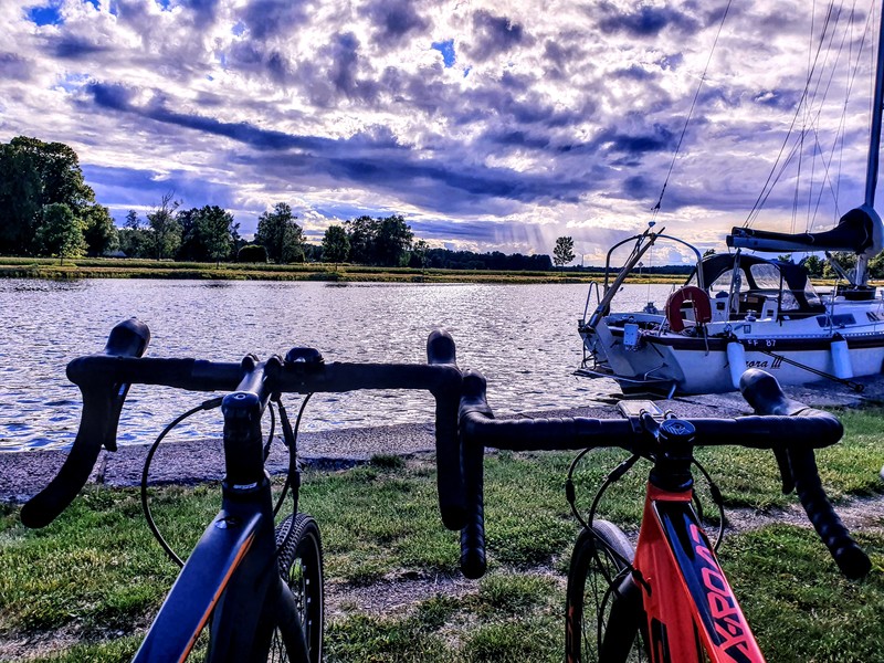 Cyklister tar paus längs Göta kanal för att titta på båtar. 2020. Bilden får användas mot att Rövardöttrar ges fotocred.