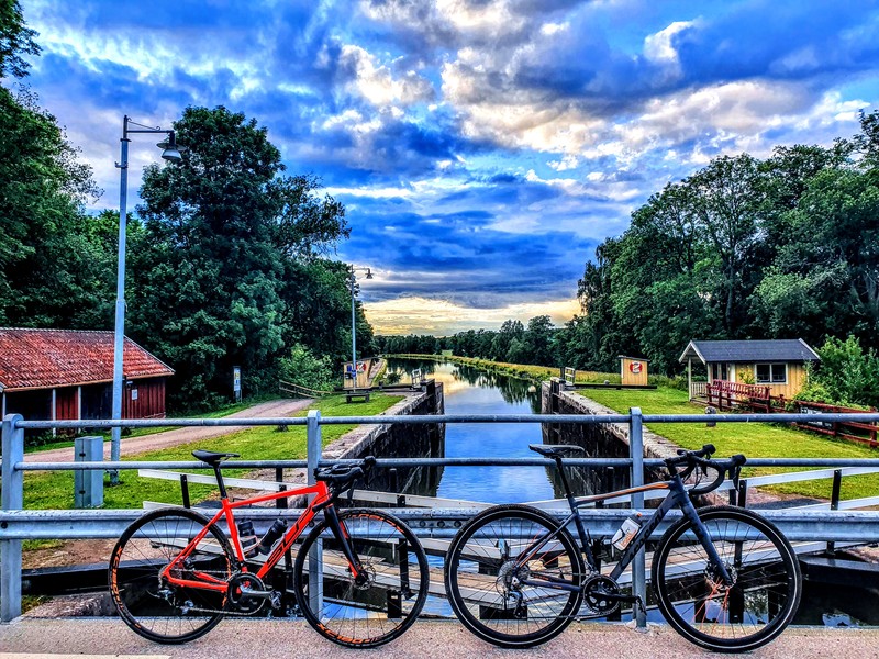 Cyklar gör paus på bro över Göta kanal. 2020. Bilden får användas mot att Rövardöttrar ges fotocred.