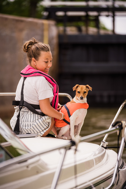 Tjej med hund på fritidsbåt i sluss. Sommarfoto 2019.