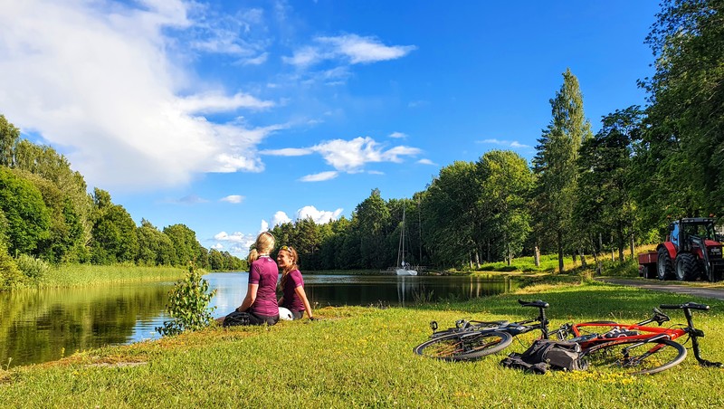 Cyklister pausar vid Göta kanal under en cykeltur 2020. Bilden får användas mot att Rövardöttrar ges fotocred.