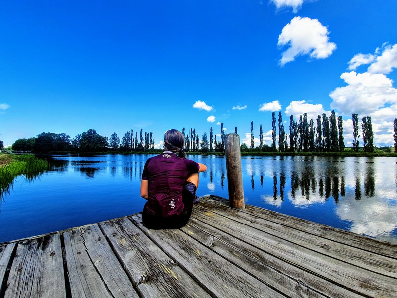 Cyklist pausar på en väntbrygga längs Göta kanal under en cykeltur 2020. Bilden får användas mot att Rövardöttrar ges fotocred.