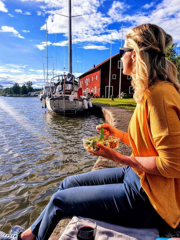 Lunch stopp på kajen i Borensberg under en cykeltur längs Göta kanal. 2020. Bilden får användas mot att Rövardöttrar ges fotocred.