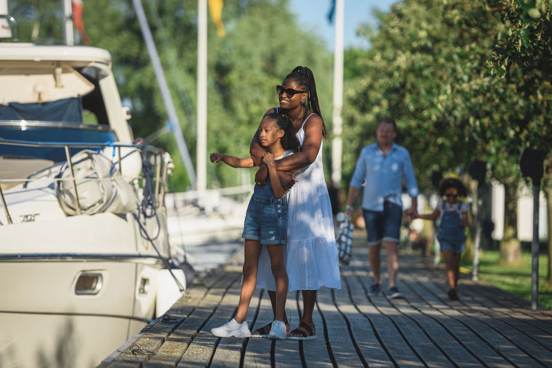Familj tittar på båtar i kanalhamnen. Sommar 2021.