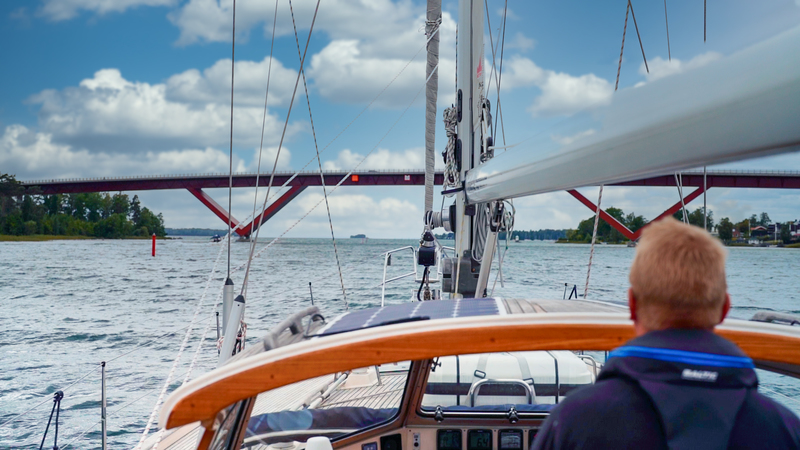 Segelbåt på väg under Motalabron och ut på Vättern. Sommar 2021.