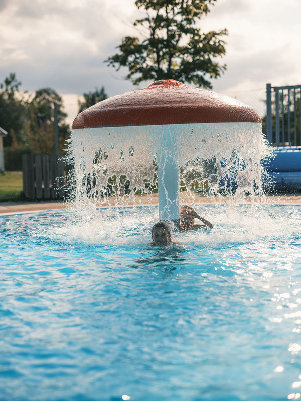 Bad i poolen vid Töreboda Camping vid Göta kanal. Sommar 2021.