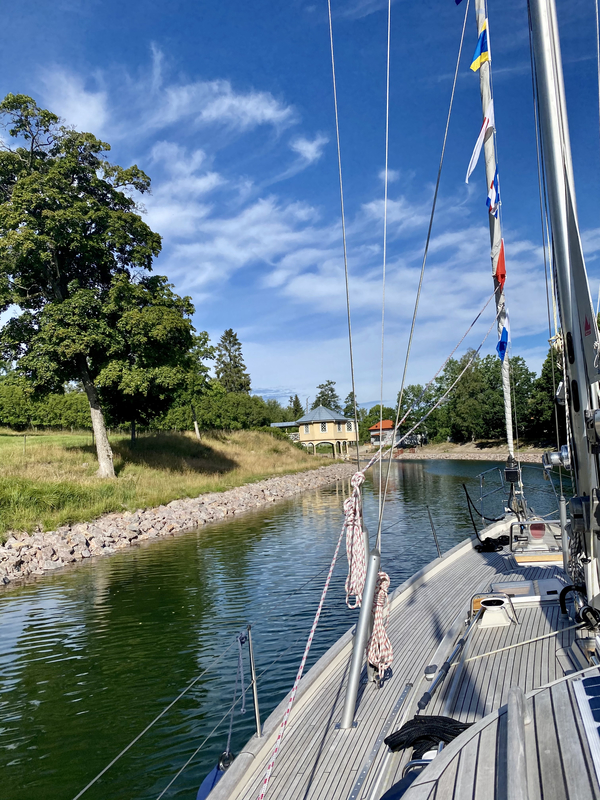Segelbåten Ingrid Marie på Göta kanal. Lusthuset vid styrmans fasa i fonden. Sommaren 2021.