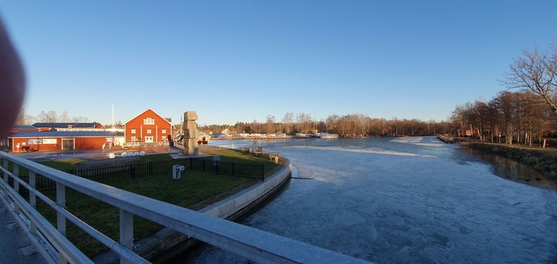 Vinter i Sjötorp 2021. Utsikt från bron över Varvsbassängen, delvis islagd.