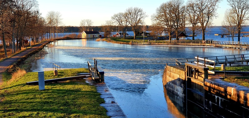 Vinter i Sjötorp 2021. Bassängen mellan Sjöslussen och Sjötorp 2-3.