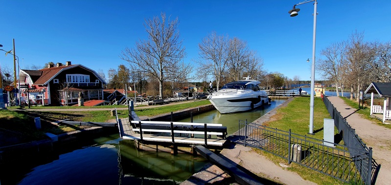 Första båten som slussade in i Sjötorp säsongen 2022.