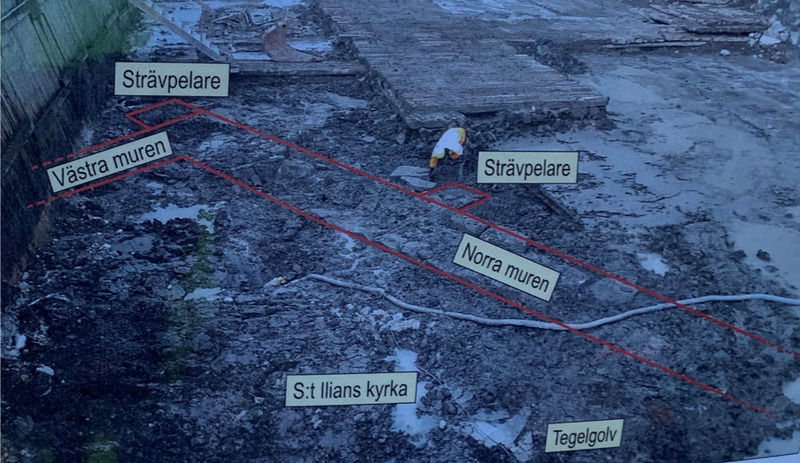 Rester av murverk och gravar från medeltida kyrka i Söderköping. Hittades vid renovering i Söderköping 21-22.