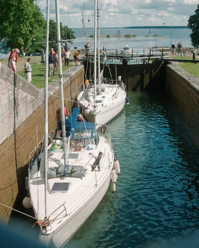 Segelbåtar på väg uppåt i Carl-Johans slusstrappa i Berg. 2022.