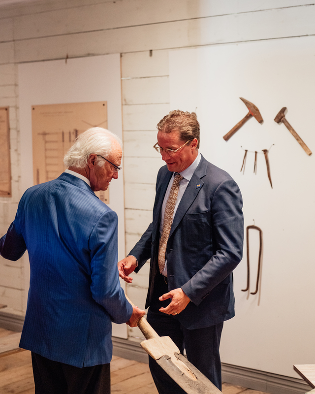 Göta kanalbolags vd Roger Altsäter visar H.K.H. Carl XIV Gustaf en av de plåtskodda spadar som användes vid grävandet av Göta kanal. Taget i samband med firandet av kanaldagen i Berg 9 juli 2022.