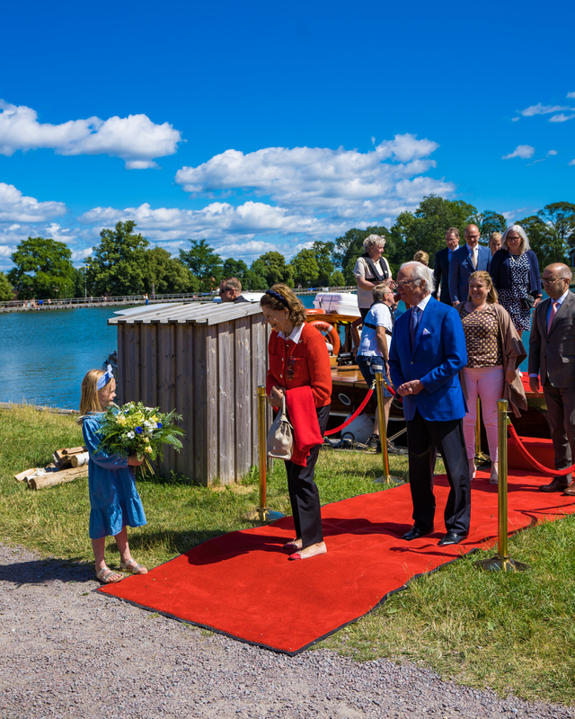 Kungaparet anländer till Berg vid kanaldagen 9 juli 2022 och uppvaktas med blommor.