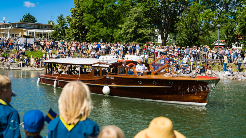 M/B Stockholm anländer till Berg med kungaparet vid kanaldagen i Berg 9 juli 2022.