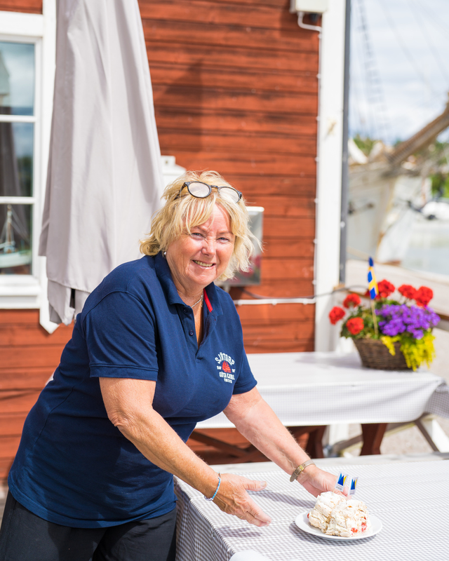 Servering av bakelse på Café Baltzar von Platen under kanaldagen i Sjötorp 10 juli 2022.