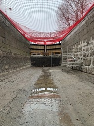 Söderköpings sluss täckt med ett säkerhetsnät under arbetet i den, vintern 2023.