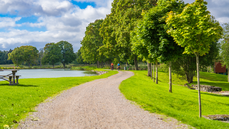 Rastplats vid Skarpåsen, med par som cyklar längre bort. 2023.