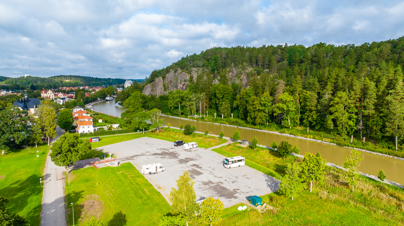 Flygbild över Söderköpings ställplats, sedd västerut. 2023.