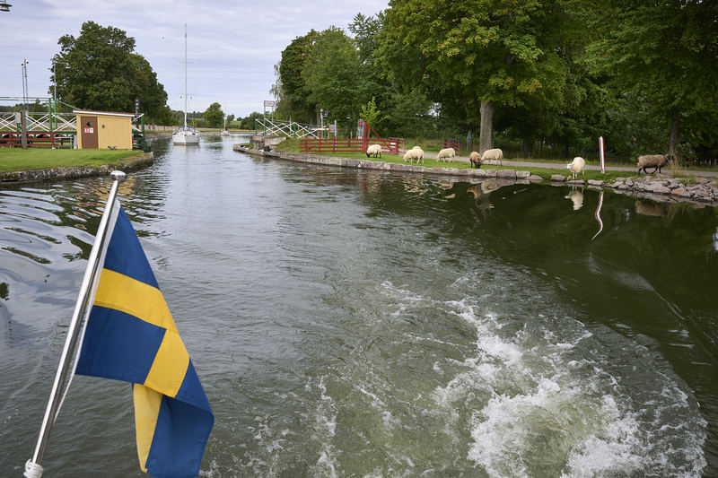 Resa i konvoj med fritidsbåt på Göta kanal sensommaren 2023.