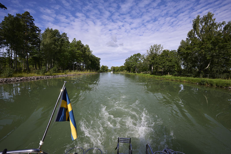 Resa i konvoj med fritidsbåt på Göta kanal sensommaren 2023.