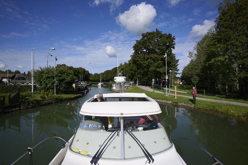 Resa i konvoj med fritidsbåt på Göta kanal sensommaren 2023.
