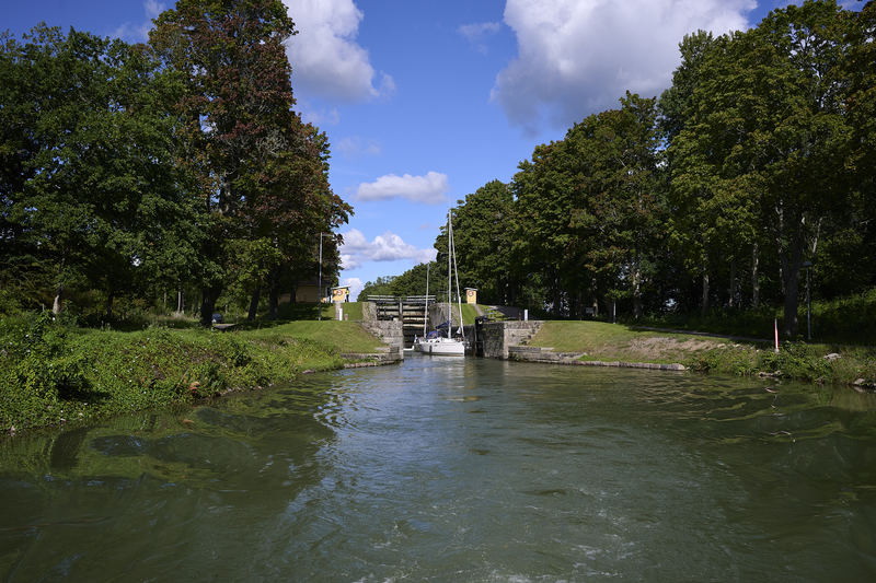 Resa i konvoj med fritidsbåt på Göta kanal sensommaren 2023.