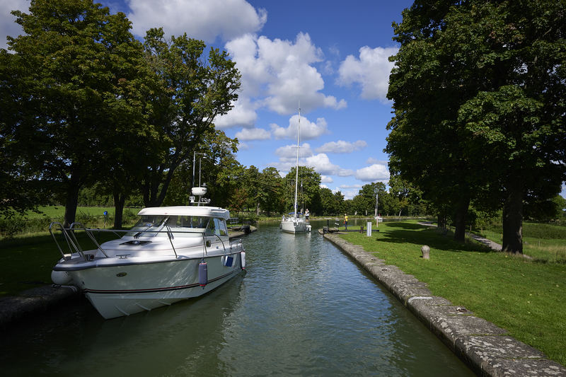 Resa i konvoj med fritidsbåt på Göta kanal sensommaren 2023.