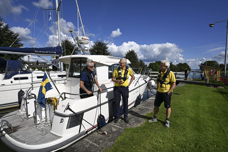 Resa i konvoj med fritidsbåt på Göta kanal sensommaren 2023. Slussvärdar i samspråk med en båtgäst.