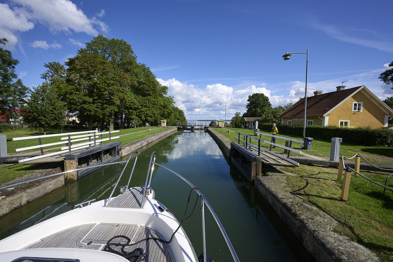 Resa i konvoj med fritidsbåt på Göta kanal sensommaren 2023.