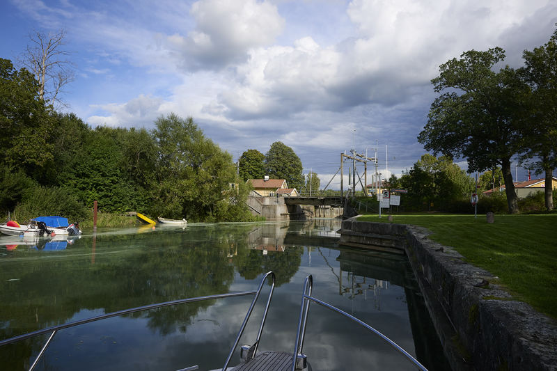 Resa i konvoj med fritidsbåt på Göta kanal sensommaren 2023. Väntan utanför järnvägsbron i Norsholm.