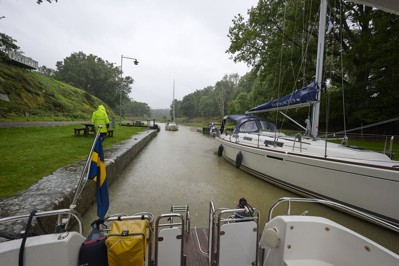 Resa i konvoj med fritidsbåt på Göta kanal sensommaren 2023. En rejält regnig sensommardag.