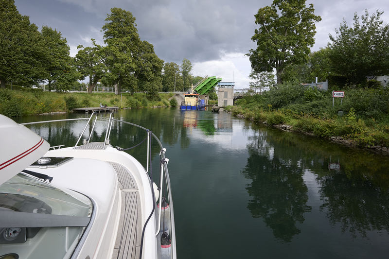 Resa i konvoj med fritidsbåt på Göta kanal sensommaren 2023. Yrkesbåt på väg genom gamla R50-bron i Motala.