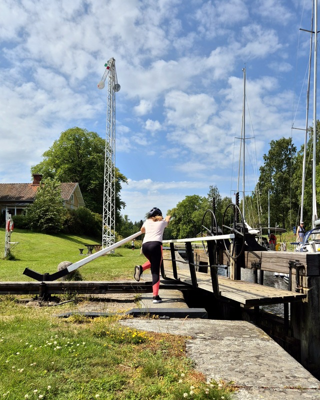 Hjälper till att öppna den manuella slussen i Tåtorp. 2024.