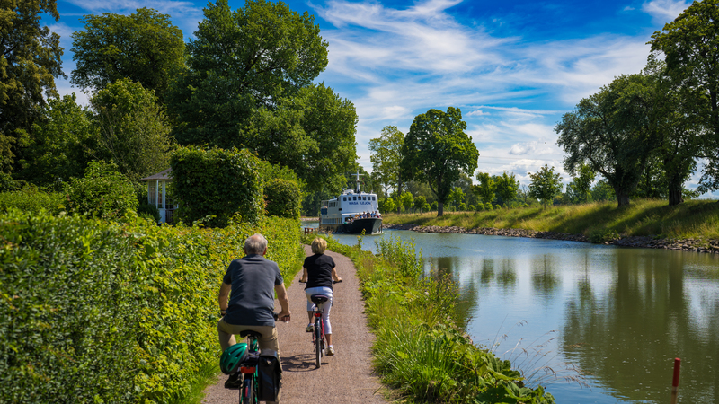 Cyklister möter M/S Wasa Lejon längs Göta kanal. 2024.