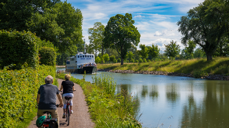Cyklister möter M/S Wasa Lejon längs Göta kanal. 2024.