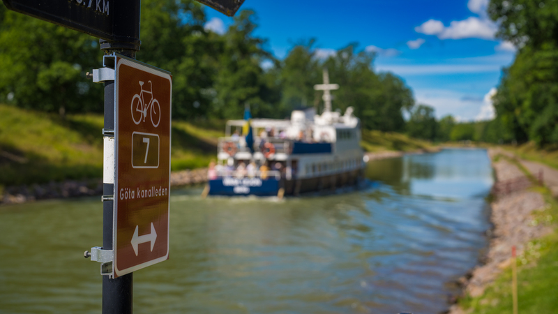 M/S Wasa Lejon på Göta kanal, som också är nationell cykelled nr 7 enligt skylten. 2024.